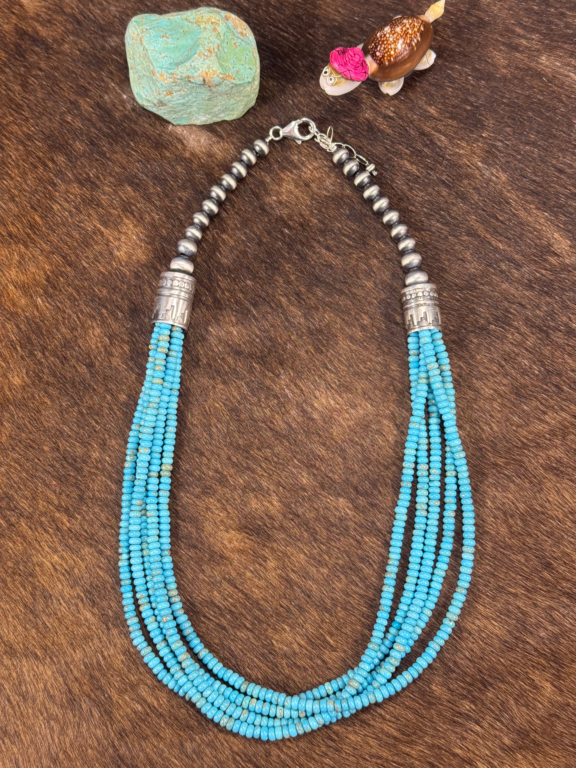 Sterling Pearl & Kingman Bead Necklace 5 Strand 22"